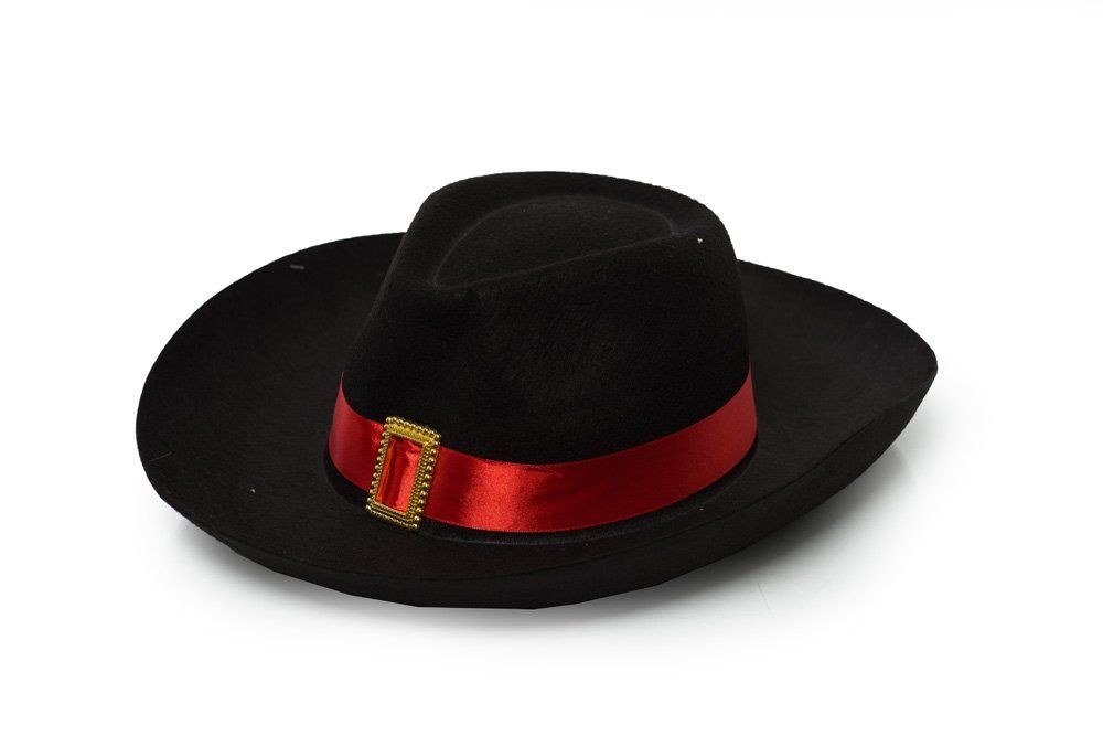 Denna musketörshatt i svart filt med rött band är en klassisk och snygg accessoar för karneval, maskerad och maskeradfester. Perfekt för att komplettera en musketör eller historisk outfit.