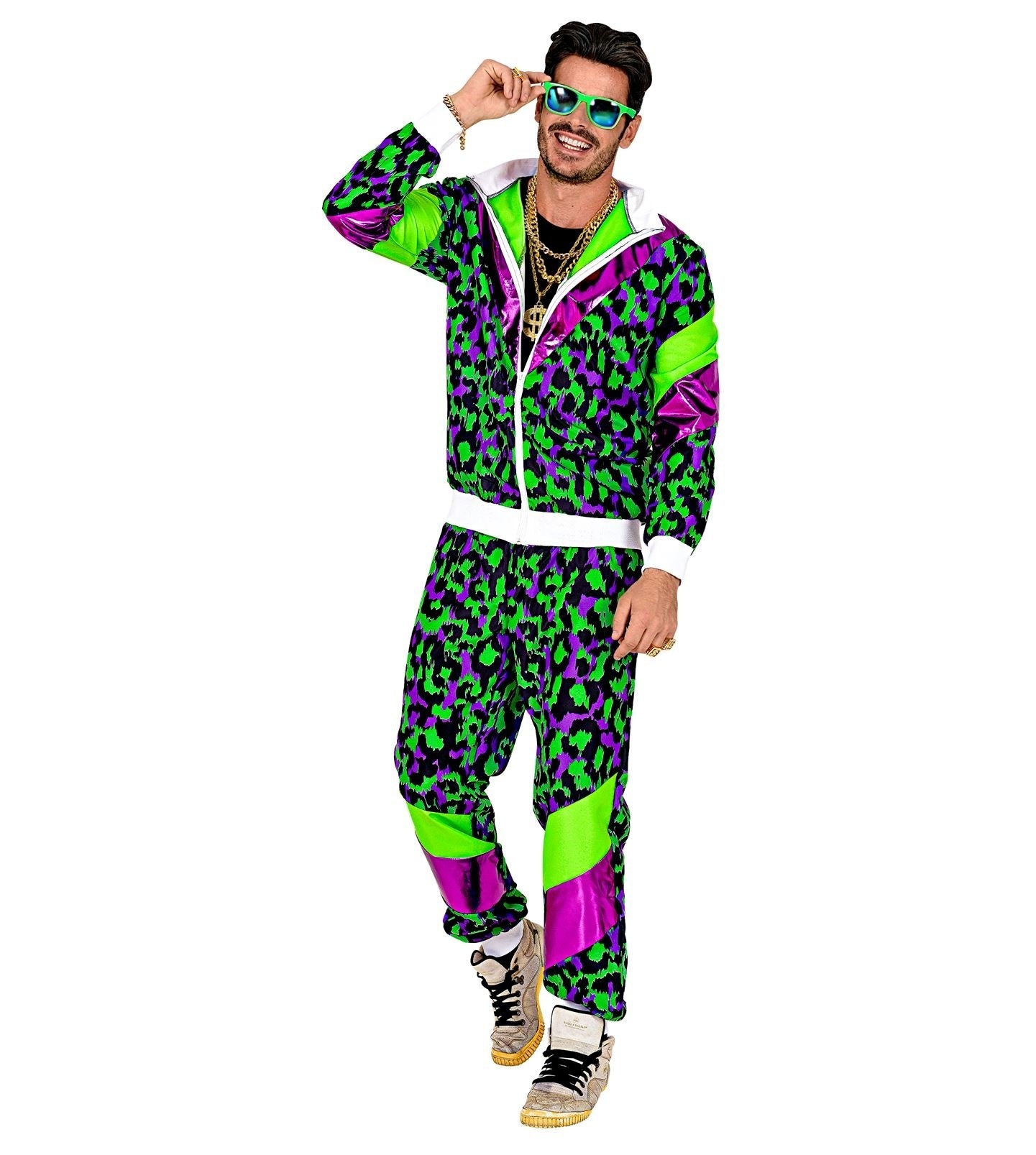 Neon 80S Träningsoverall Felaktig Neon Grön Animal Print