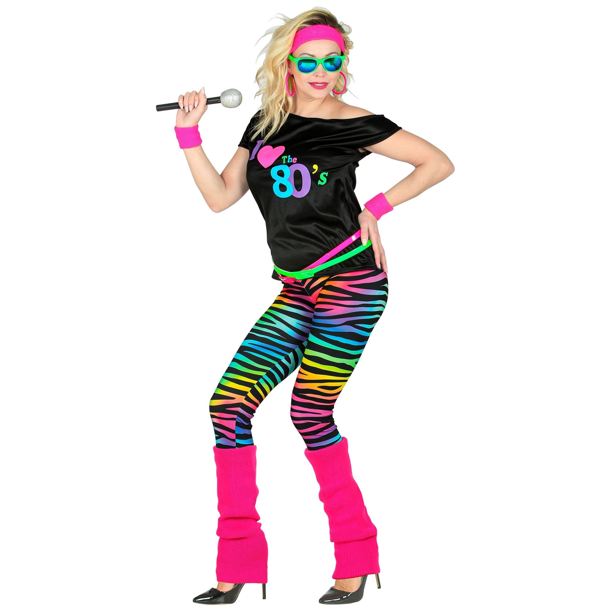 Beskrivning: 1980-tals mode ärmlös t-shirt, leggings, benvärmare, pannband, 2 armband