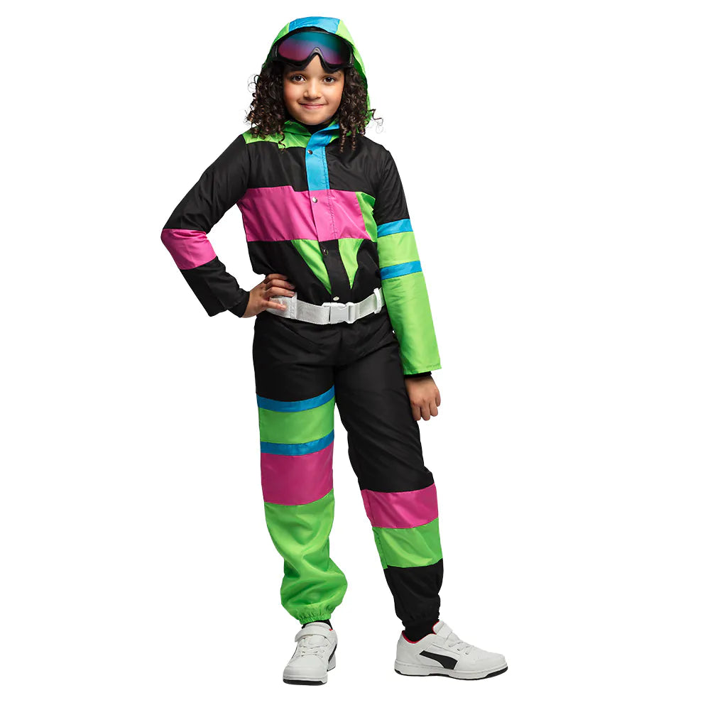 Gå tillbaka i tiden med den här roliga retroskiddräkten som inspirerats av 80- och 90-talets färgglada och djärva stil. Finns även i en dam- och herrversion, så festa med stil med hela familjen. Dräkten innehåller en jumpsuit, bälte och skidglasögon.