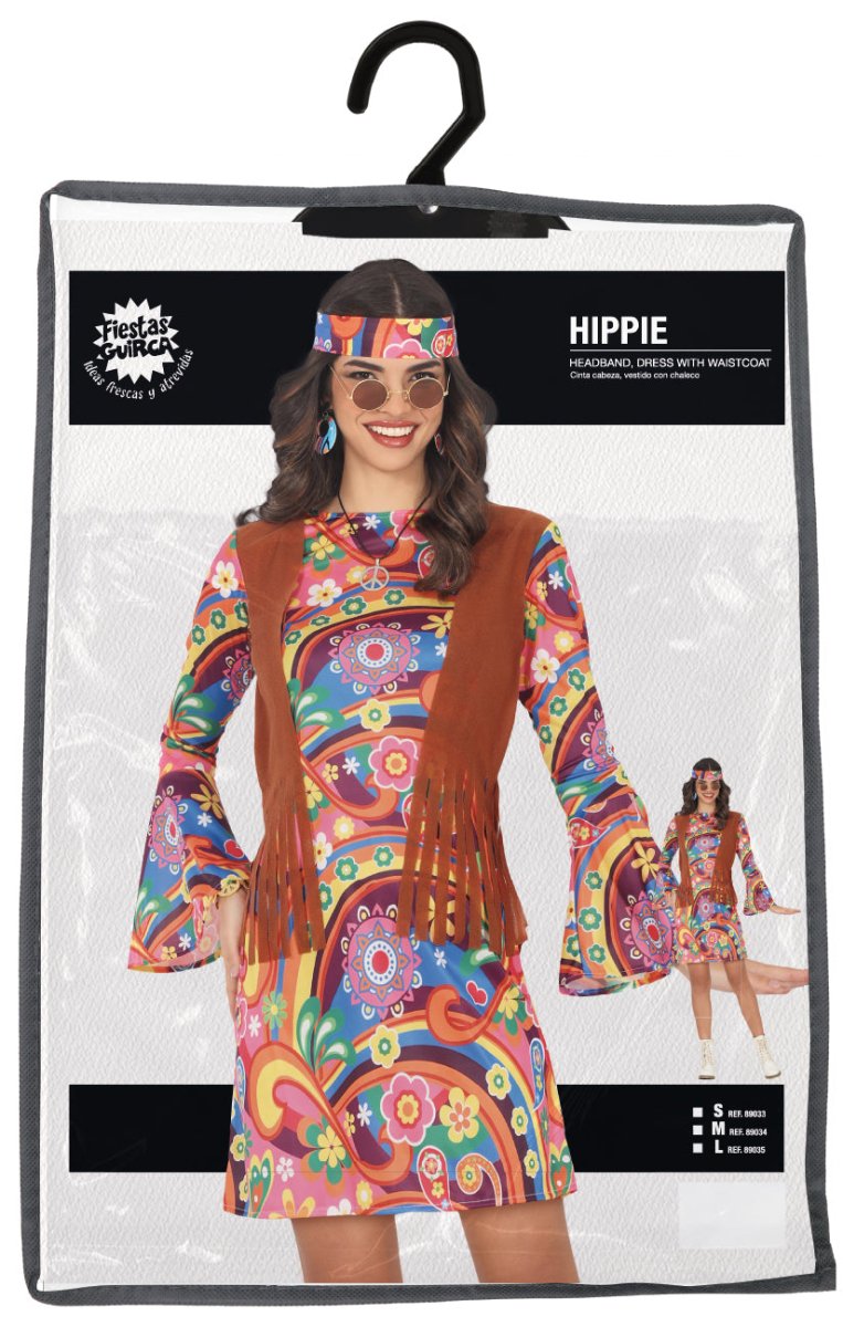 Denna hippiedräkt består av en färgglad klänning och ett matchande pannband. Dräkten är tillverkad av bekväm polyester och ger en autentisk och festlig look för temafester, karnevaler eller maskerader.