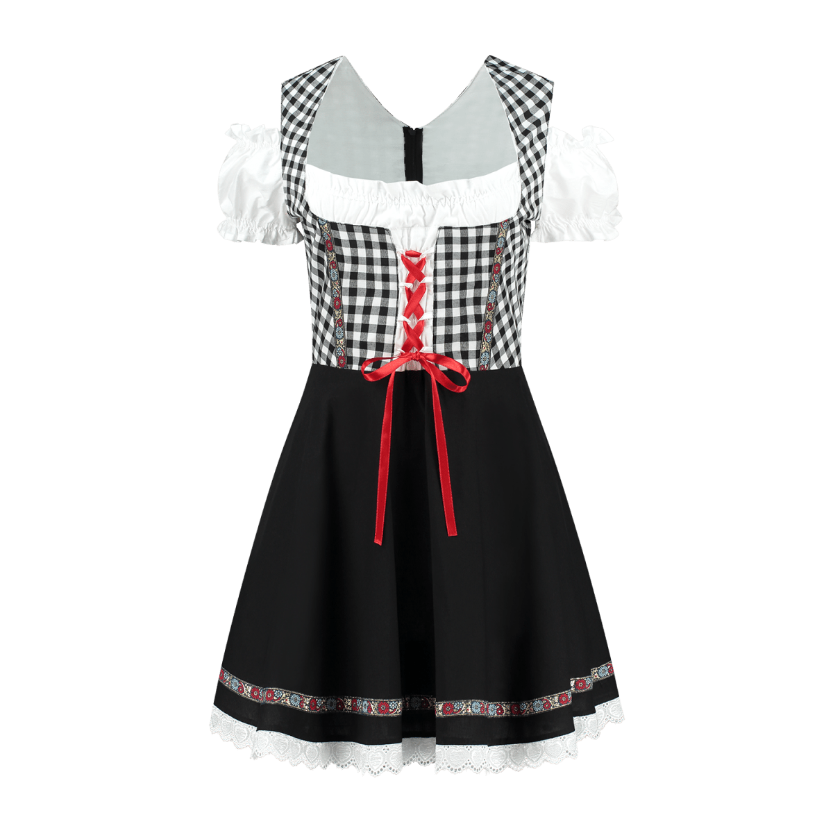 Dirndlklänning med enfärgad blus, elastisk halsringning och svart/vitrutig topp. Toppen är tillverkad av 55% bomull och 45% polyester. Blusen och kjolen är tillverkade av 100% bomull. Helt fodrad. Med vackra band på bröstet och kjolen. Kjolen är kantad med finaste spets. Kjolens längd ca 45 cm. Blixtlåsen är gjorda av YKK-dragkedjor. I dirndlen finns en ficka. Tillgänglig i storlekarna 34 till 46.