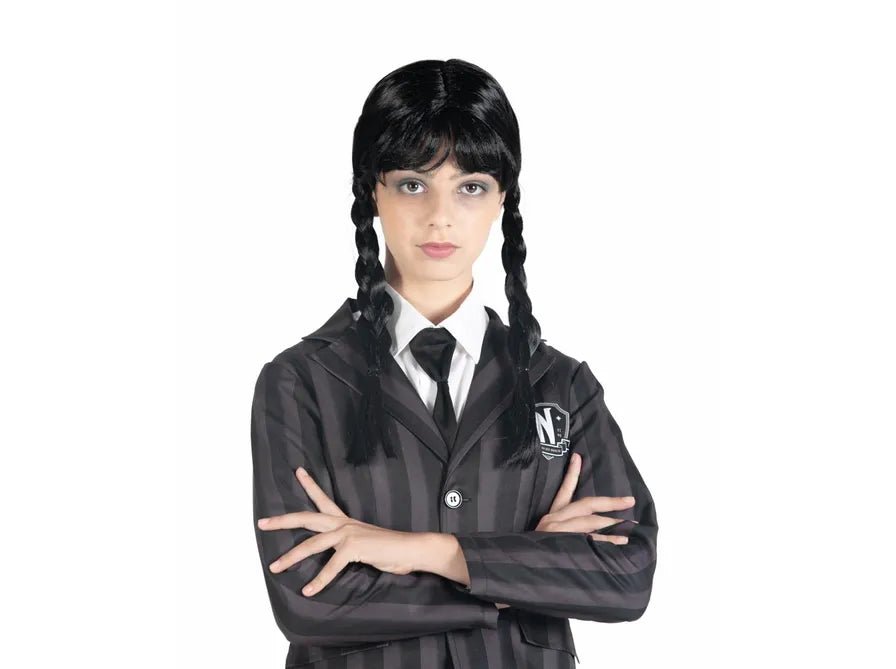 med denna svarta peruk med flätor kan du skapa den igenkännliga looken av Wednesday Addams på nolltid. Perfekt för maskerad, Halloween, cosplay eller temakvällar där en mystisk look är nyckeln.