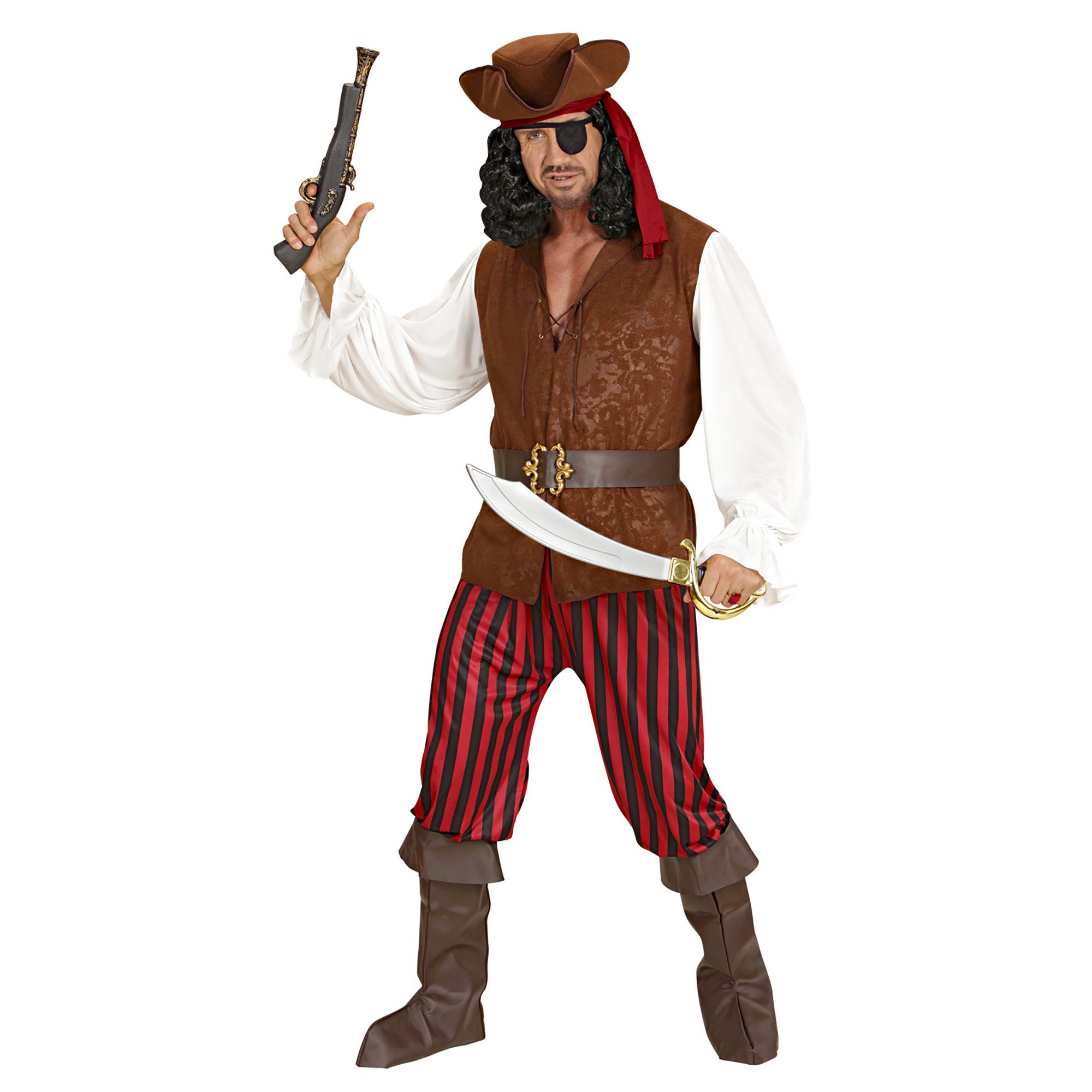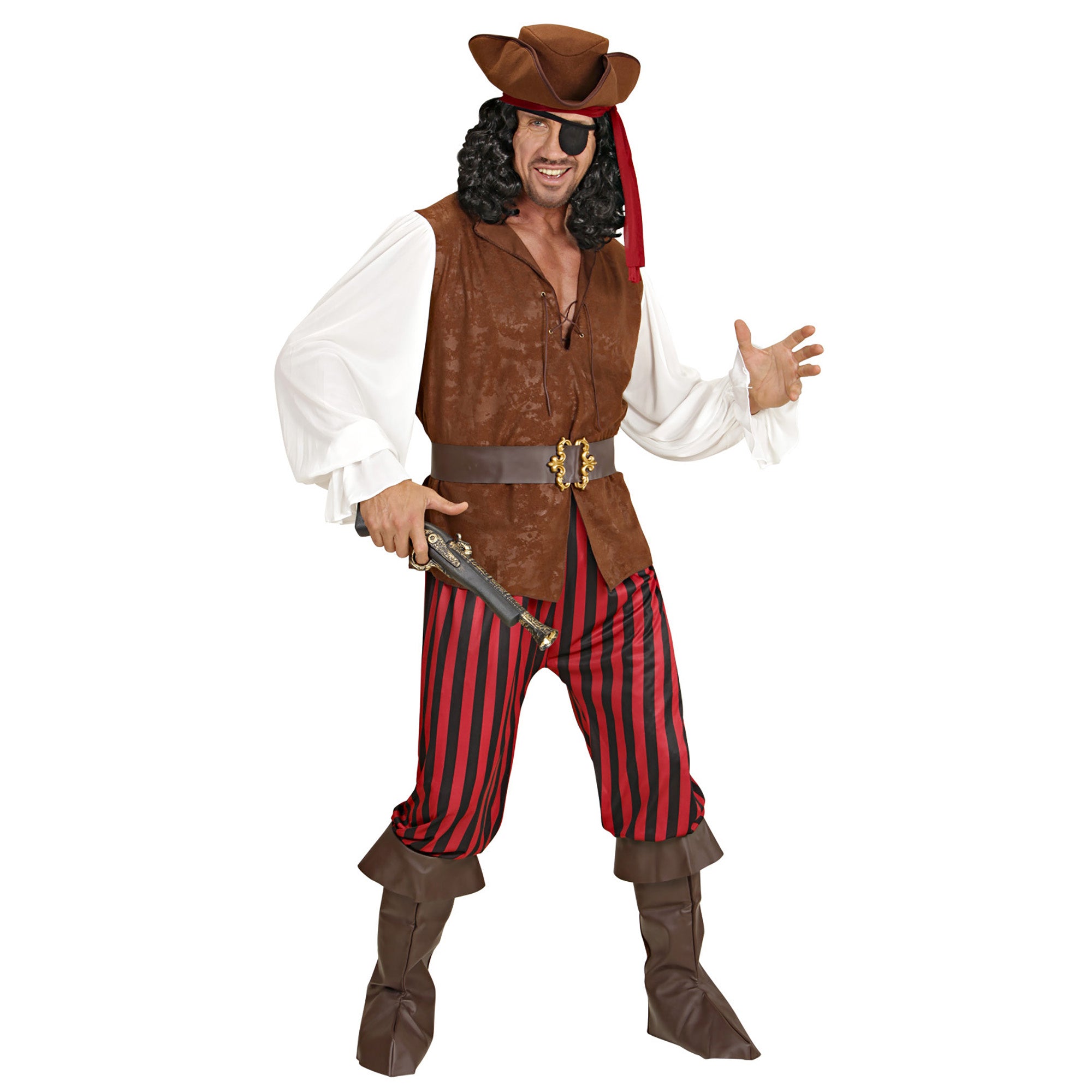 Beskrivning: pirattröja med väst, byxor, bälte, stövelskydd, pannband, hatt, ögonlapp