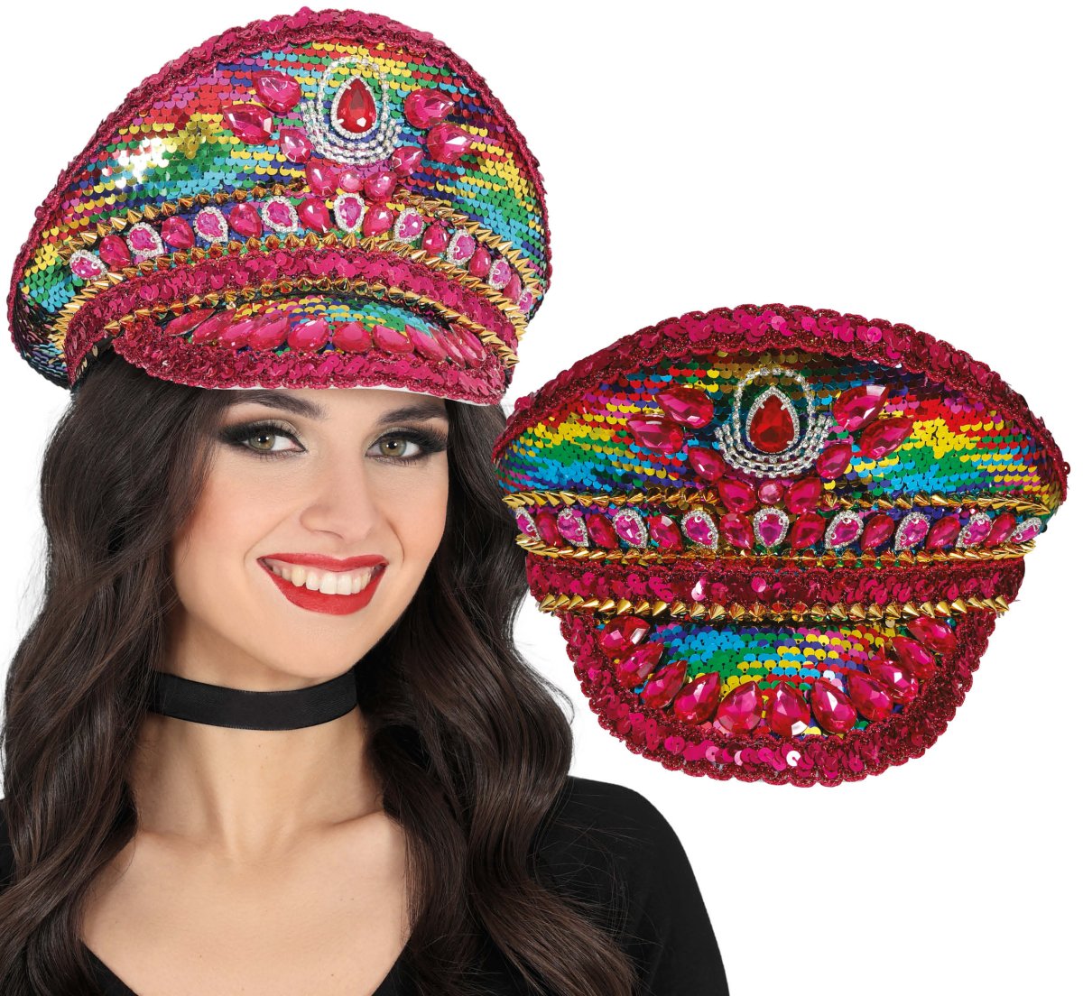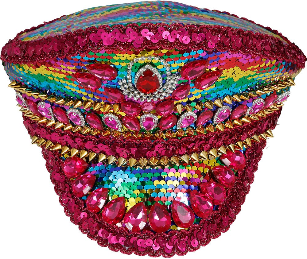 Få uppmärksamhet med denna festliga polismössa i regnbågens färger, med gnistrande stenar och ett rosa band. En perfekt kombination av tufft och lekfullt, perfekt för fester och festivaler.