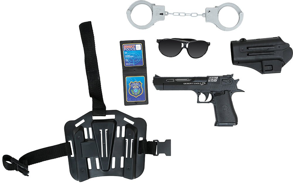 Police Dress Up Set - 6-Piece är det perfekta setet för unga detektiver som gillar att ta på sig rollen som en riktig polis. Med det här kompletta svarta setet kan barnen ha massor av fantasi, rollspel och spännande äventyr. Perfekt för maskerad, karneval, skolaktiviteter eller vardagsskoj.