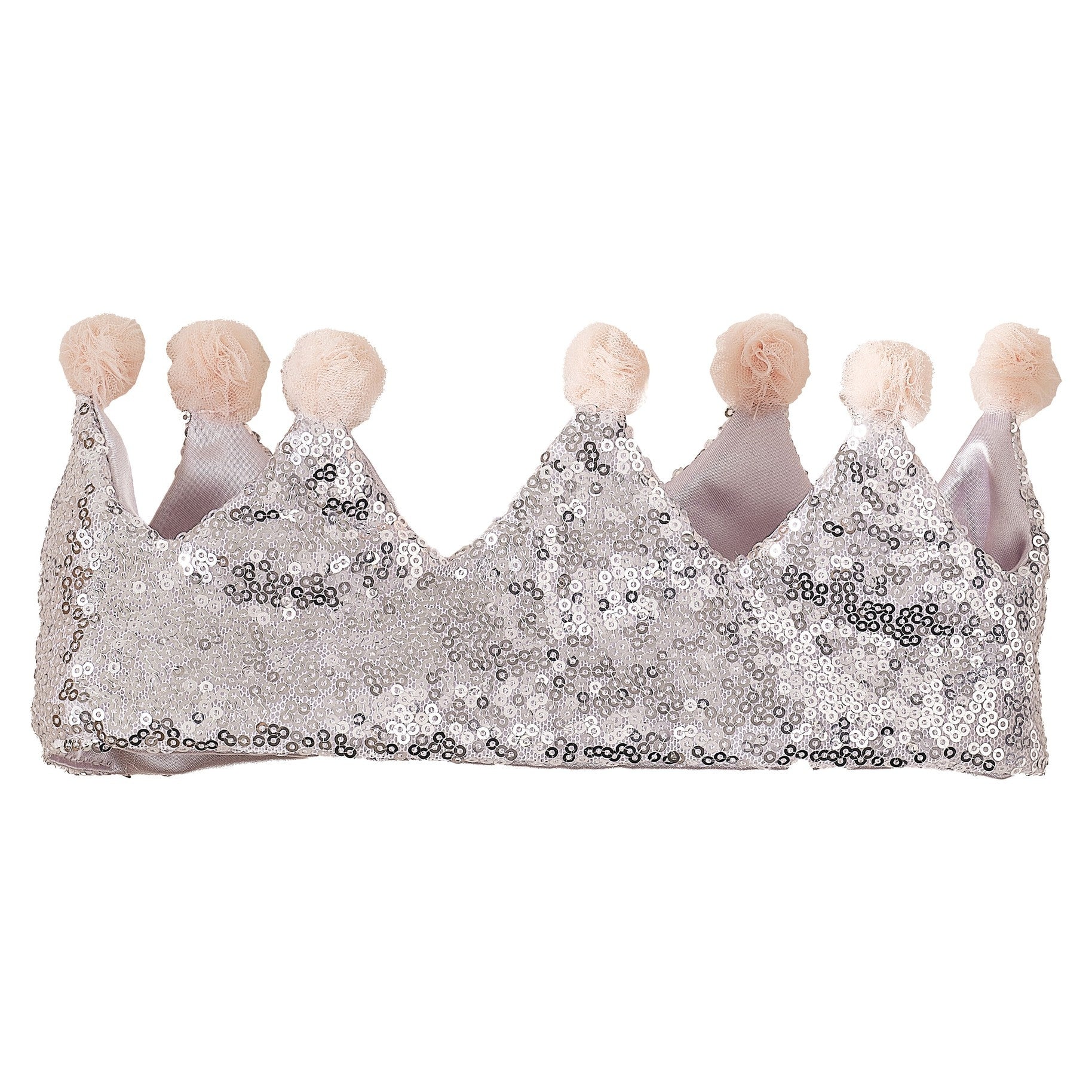 Den här kronan är tillverkad av silversatin, dekorerad med vackra silverpaljetter och avslutad med rosa tyllpomponger.