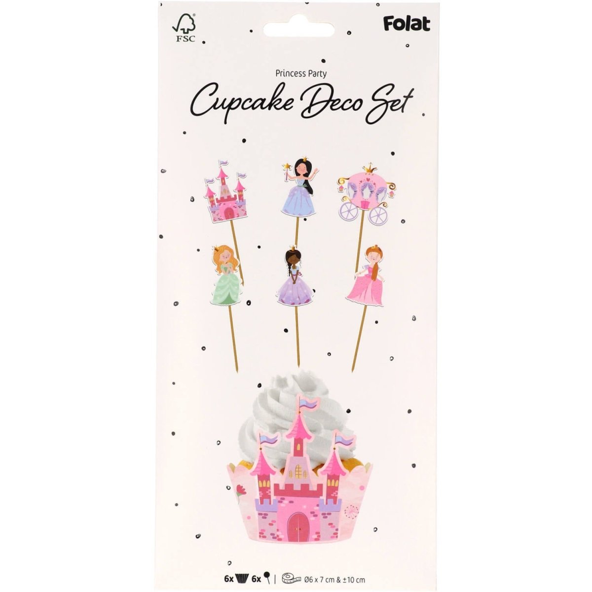 För kungliga godsaker. Cupcake-dekorationsset - Pretty Princess - 6 set. Innehåll: 6 set som vardera består av ett cupcakeomslag och en sampler med pappersfigur. Kan t.ex. användas under följande fest/festtillfällen: Barnkalas, Födelsedag, Temakalas. Detta cupcake-set förvandlar vilken tårta som helst till en prinsessvärld: 6 cocktailpinnar på ca 10 cm med en prinsessa, vagn eller slott på varje, och 6 rosa wrappers på ca 22,5 cm långa x 5 cm höga med ett sagoslott på. Detta set med cupcake-dekorationer tillhör Pretty Princess-kollektionen från