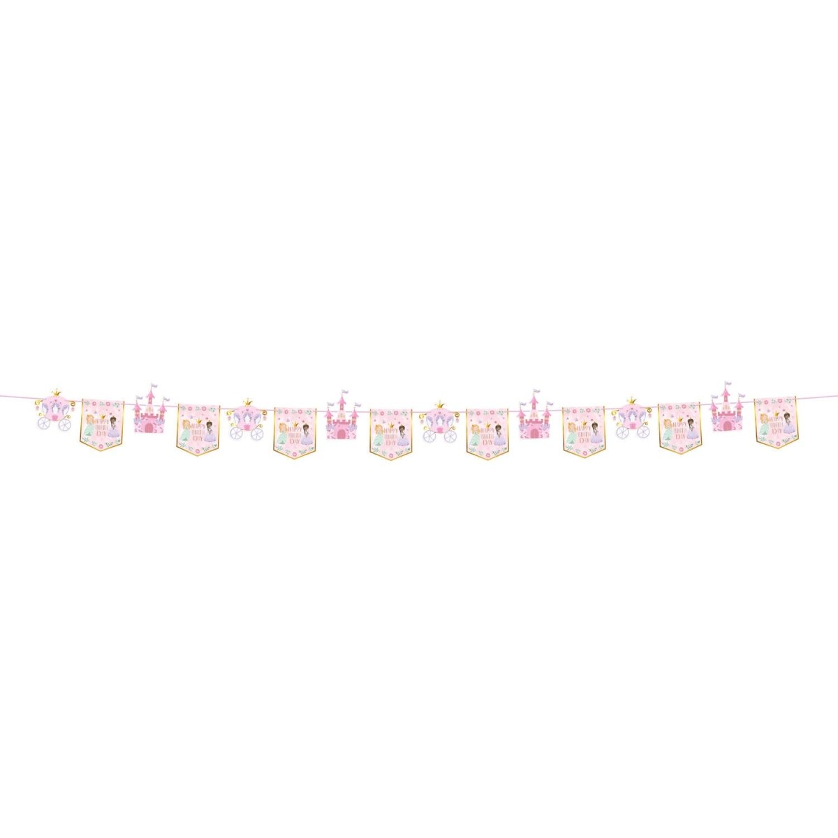 För förtrollande prinsessfester. Flagglina - Pretty Princess - 6 meter. Innehåll: 1 flagglina. Kan t.ex. användas under följande kalas/festtillfällen: Barnkalas, Födelsedag. Det här blir verkligen ett kalas för prinsessor! På denna 6 meter långa flagglina finns 16 flaggor i storleken ca 17 x 21 cm. Det finns 3 typer av flaggor: en rosa flagga med texten "HAPPY BIRTH DAY" och två prinsessor, en i form av ett slott och en i form av en vagn. Alla flaggorna har en vacker gulddetalj som verkligen skiner tack vare den varma stämplingstekniken som använts! Flaggorna är tryckta på båda sidor. De kan skjutas fram och tillbaka över det rosa bandet. Denna flagglinje tillhör Pretty Princess-kollektionen av
