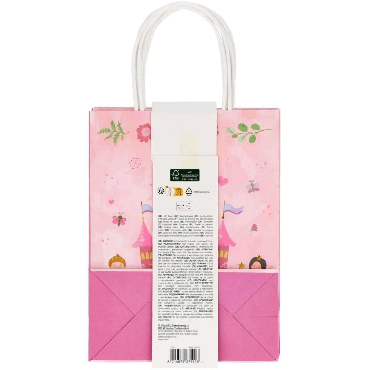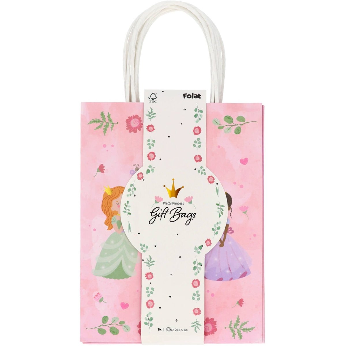 För kungliga presenter. Presentpåsar - Pretty Princess - 20 x 27 cm - 6 stycken. Innehåll: 6 presentpåsar. Kan t.ex. användas under följande fest/festtillfällen: Barnkalas, Födelsedag. Söta presentpåsar med måtten 20 x 27 x 10 cm. Mjukt rosa med på ena sidan två prinsessor och texten "HAPPY BIRTH DAY" och på andra sidan ett slott med två prinsessor. Inklusive handtag är påsarna ca 37 cm höga. Med gulddetaljer som verkligen gnistrar tack vare den använda hot-stamping-tekniken. Dessa presentpåsar tillhör Pretty Princess-kollektionen från Folat. Denna artikel är tillverkad av papper.