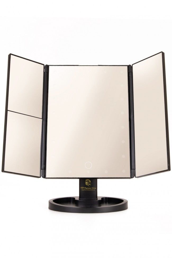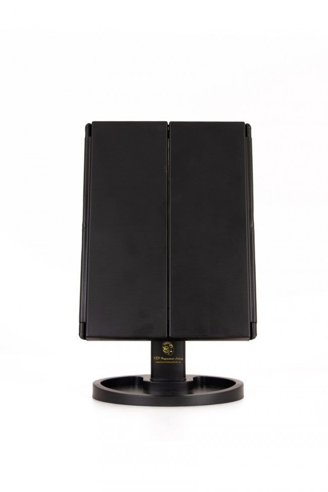 Med denna belysta spegel kommer din sminkning/makeup alltid att bli rätt från och med nu. Spegeln har LED-belysning så att ditt ansikte alltid är perfekt upplyst och du aldrig missar en detalj. Den tredelade designen gör spegeln hopfällbar och lätt att bära med sig. Belysningen drivs av 4 AAA-batterier så att du kan placera spegeln var som helst, men du kan också ansluta den till en USB-kabel. Mått på spegeln: - 35 cm x 28,5 cm x 11,5 cm Färger: - svart Material: - plast - spegel/glas Led-belysning - 4x AAA-batteri ( Exkl ) - eller via USB-anslutning ( Inkl ) Förpackningsmått: -29 cm x 19 cm x 7 cm Övrig info: - 180¡ rotationsfunktion - använd stående eller liggande - 22 starka LED-lampor - 2x och 3x förstoring - Praktisk bricka för smink etc.