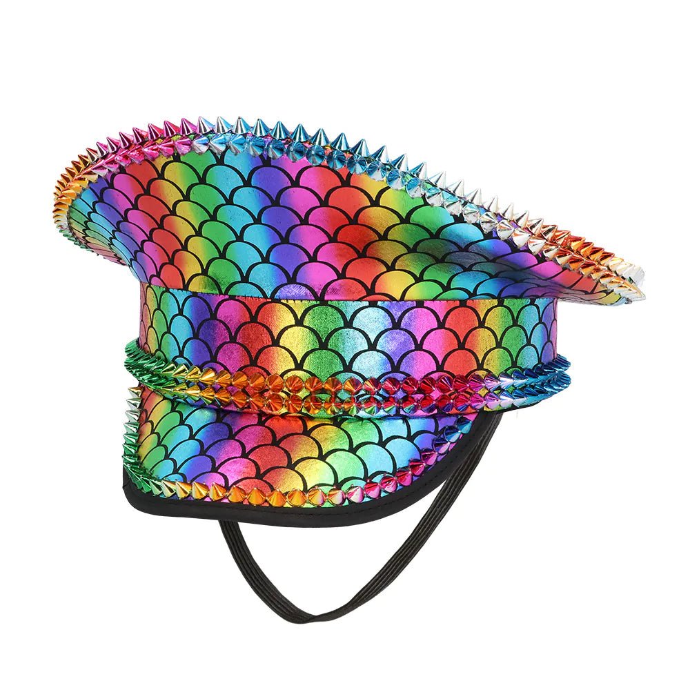 Den här iögonfallande kepsen i metallic regnbågsfärger skapar en snygg och trendig look. Nitar ger kepsen en extra touch av lyx och tuffhet. Oavsett om du ska gå på Pride, fira karneval eller gå på en dålig fest är den här kepsen den ultimata accessoaren för att komplettera din look.