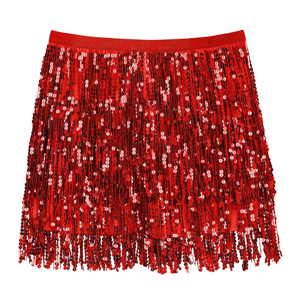 Låt dig själv skina med den här glittrande röda minikjolen! Kjolen är dekorerad med skimrande paljetter och lekfulla volanger och rör sig med varje steg för en oemotståndlig effekt. Perfekt för fester, karnevaler eller maskerader.