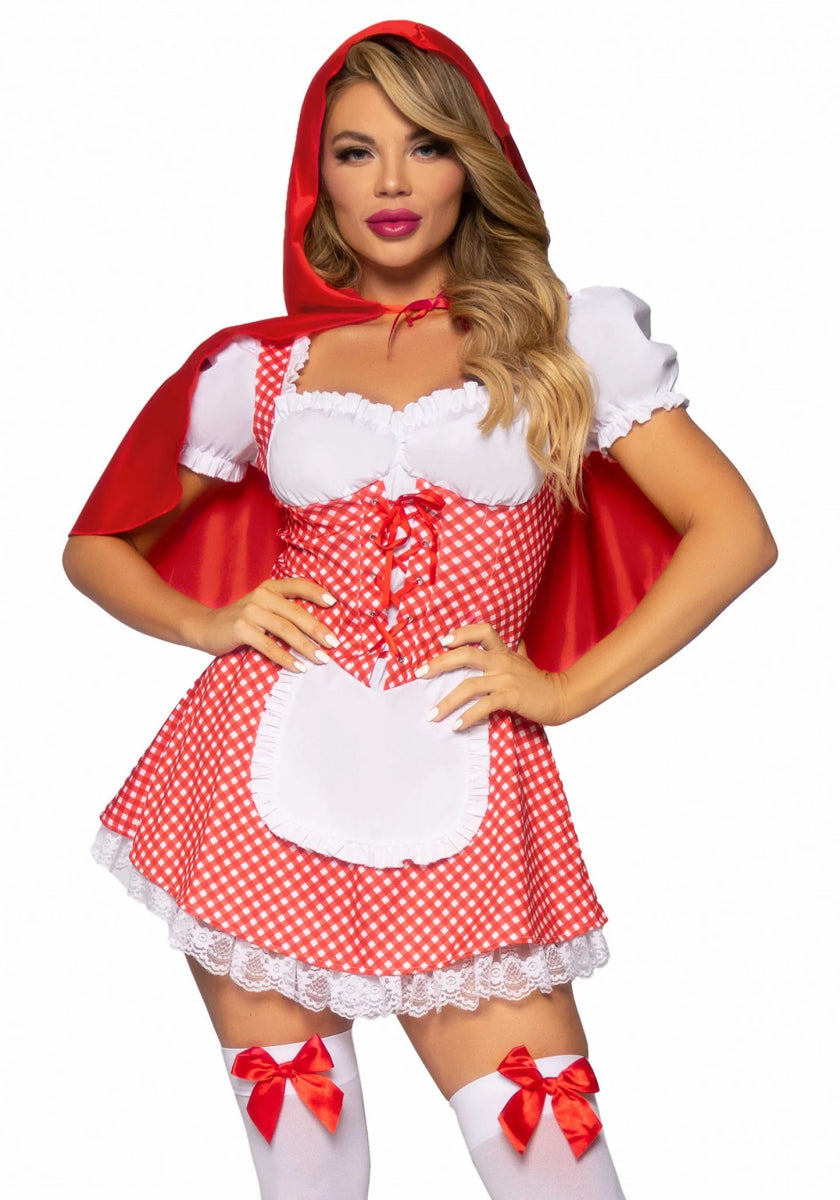 Hoppa in i skogen med förtroende i Red Riding Hood-kostymen av Leg Avenue! Denna sagodräkt innehåller en charmig ginghamklänning med en ruffad byst, korta ärmar, en snörning fram, ett bifogat förkläde och en cape med huva. Det är den perfekta utstyrseln för karneval, Halloween eller en fest med sagotema! 🌹🐺