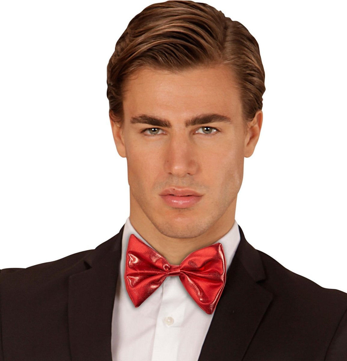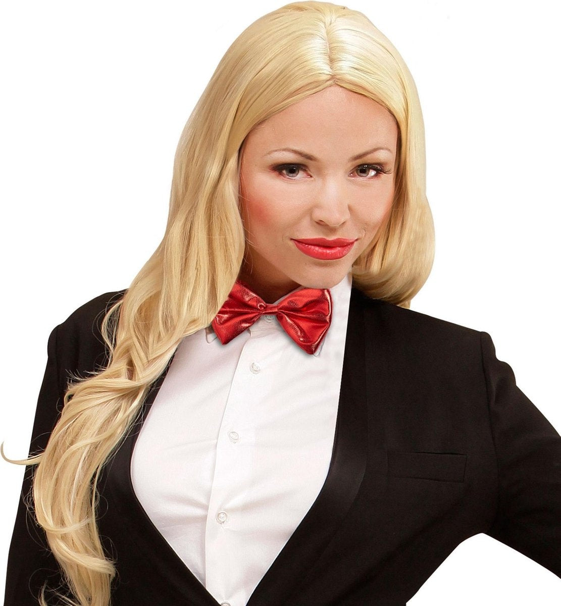 Den här flugan är för vuxna. Den är tillverkad av metallicrött tyg. Flugan mäter ca 7,5 x 11,5 cm. Den kan fästas med ett rött elastiskt band runt halsen. Denna fluga kommer att vara perfekt för att komplettera en kostym på en maskeradfest!