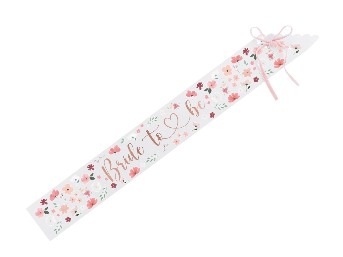 Pappersskärp för blivande brud, vitt med färgat tryck och metalliserad inskription i roséguld, bredd ca 9,5 cm, längd ca 76 cm.