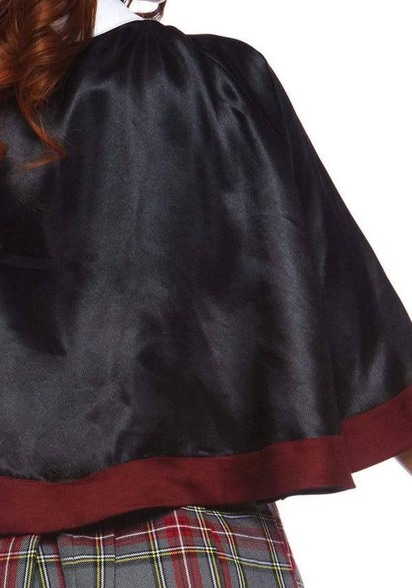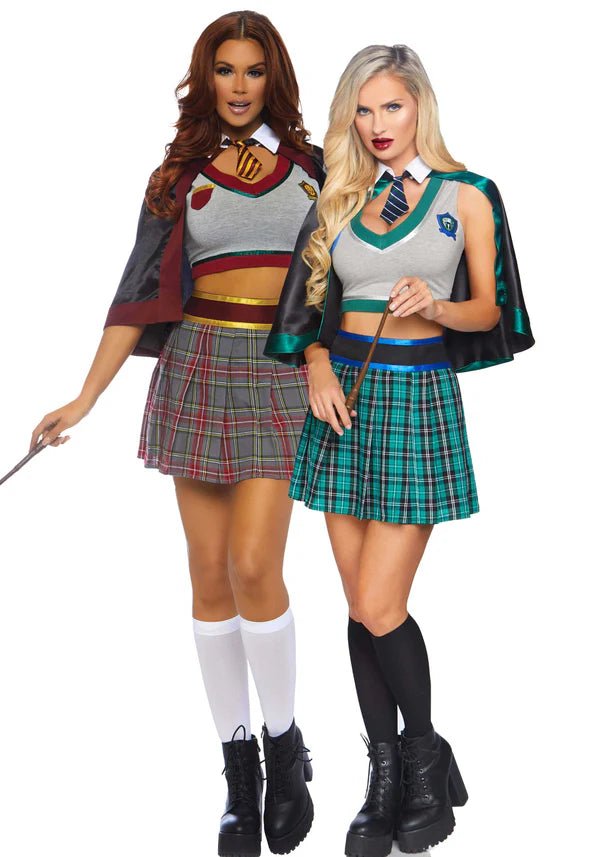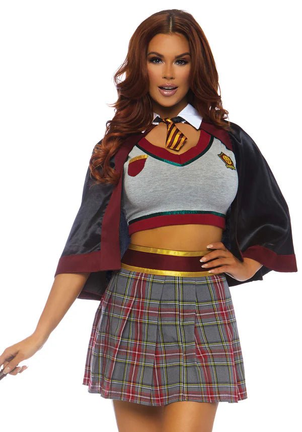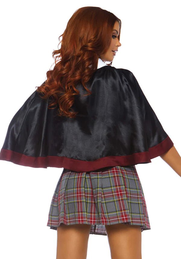 Visa upp dina magiska färdigheter i 3-delars Spellbinding School Girl-set från Leg Avenue! Denna förtrollande outfit innehåller en topp med märkesdetaljer, en hög midja med rutig kjol och en cape med fäst slips. Perfekt för Halloween, temafester eller en magisk cosplay-look! 🖤📚