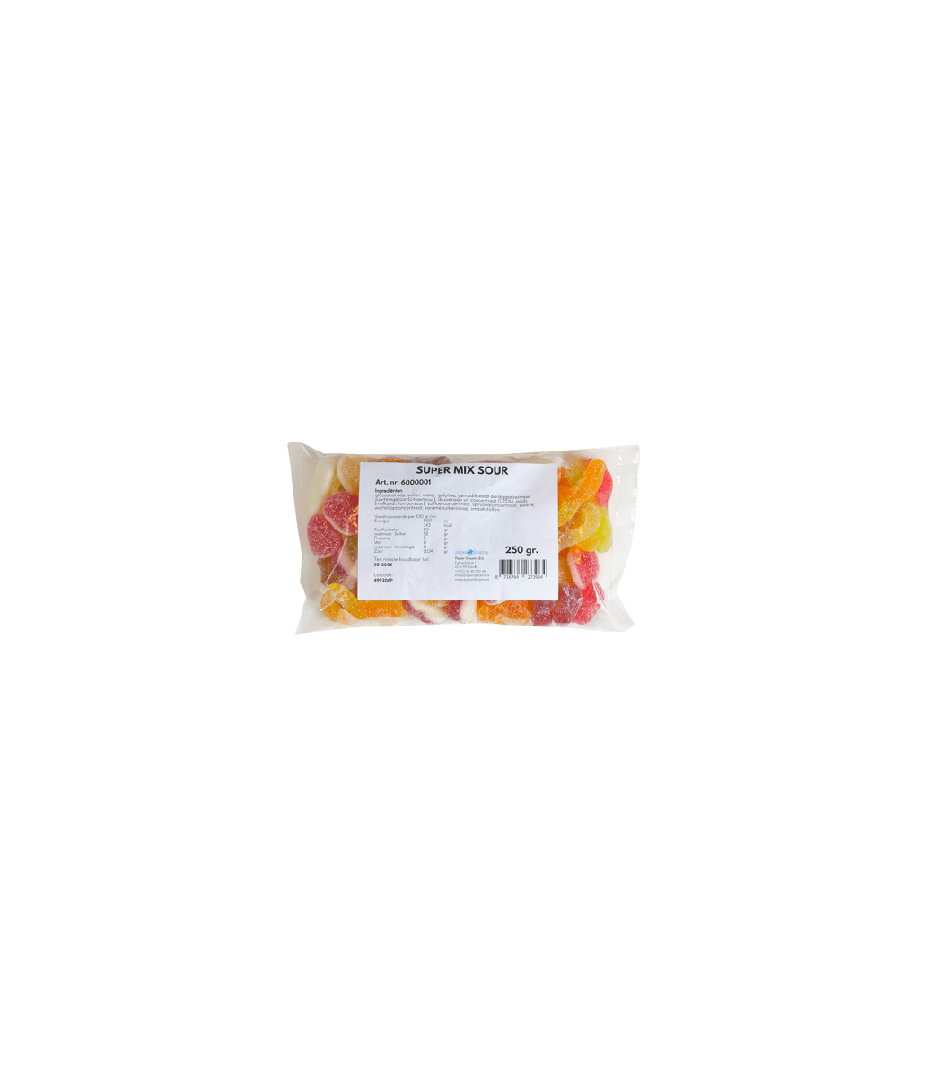 Gillar du sötsaker som verkligen får det att vattnas i munnen? Då är vår Super Sour Mix precis vad du letar efter! Den här färgglada mixen är full av olika sura godisar med fruktiga och intensiva smaker. Varje tugga är en överraskande smakexplosion som stimulerar dina sinnen.