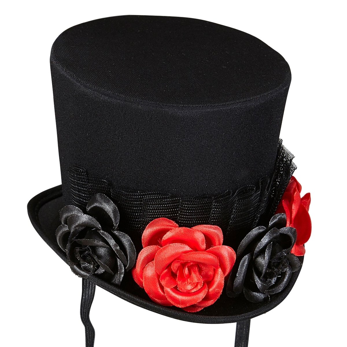 Förpackningens innehåll: mini topphatt med tyll, 4 rosor