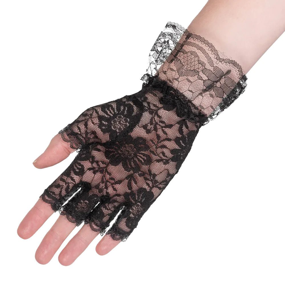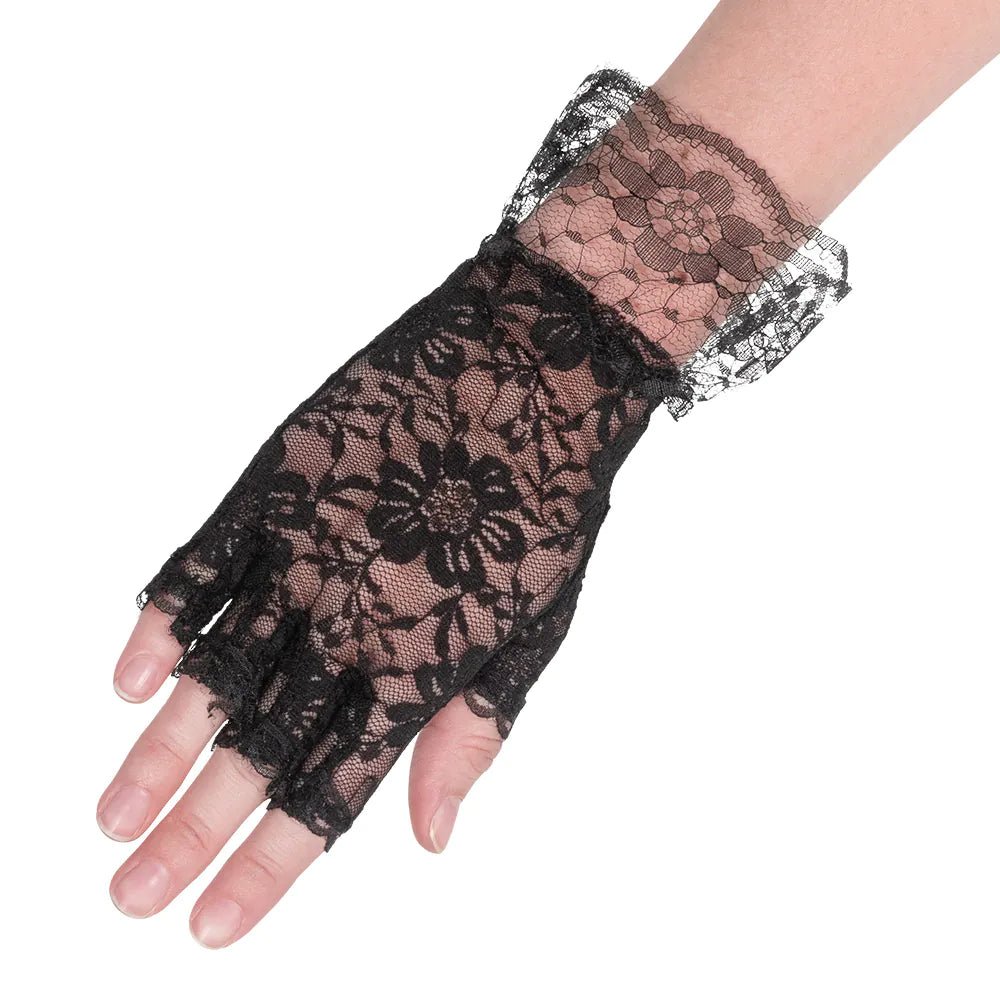 Dessa eleganta fingerlösa spetshandskar är perfekta för att komplettera en 1920-tals flapperdräkt till perfektion. Den vackra svarta spetsen ger handskarna en vintage glamour look inspirerad av tjugotalets charleston stil.