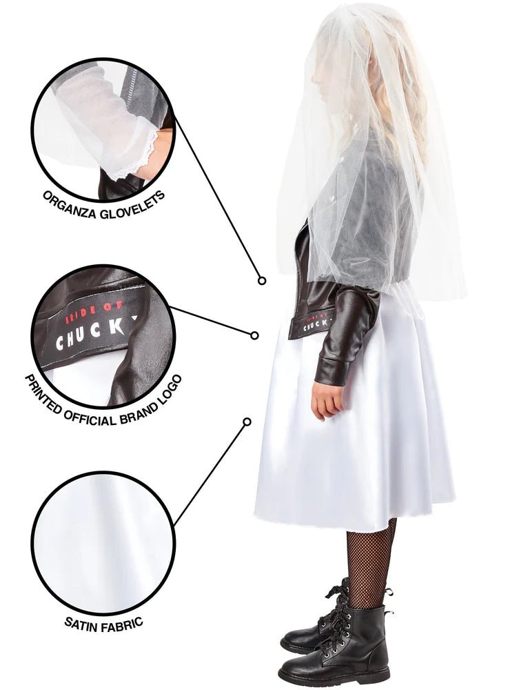 Låt ditt lilla skräckfan förvandlas till Tiffany, den ökända Chuckys brud. Med denna kompletta outfit, inklusive klänning med tillhörande jacka, slöja och handskar, kommer de att vara i skinnet på den ikoniska dockan från den berömda filmserien på några sekunder. Extra kul: kombinera den med matchande Chucky- och Tiffany-dräkter för hela familjen, från småbarn till vuxna.