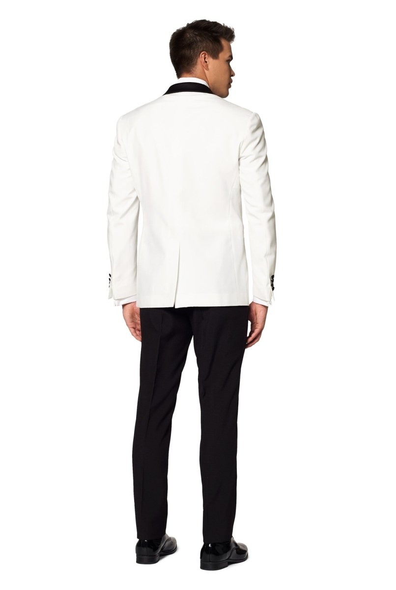 En offwhite smokingkavaj tillsammans med svarta smokingbyxor med dubbelveck och fluga är ett av de mest eleganta alternativen för formell klädsel och låter dig sticka ut med stil. Den är lämplig för black tie-evenemang, formella tillfällen på dagtid och formella tillfällen på sommaren. Parly White-smokingen har satinuppslag och en modern passform.