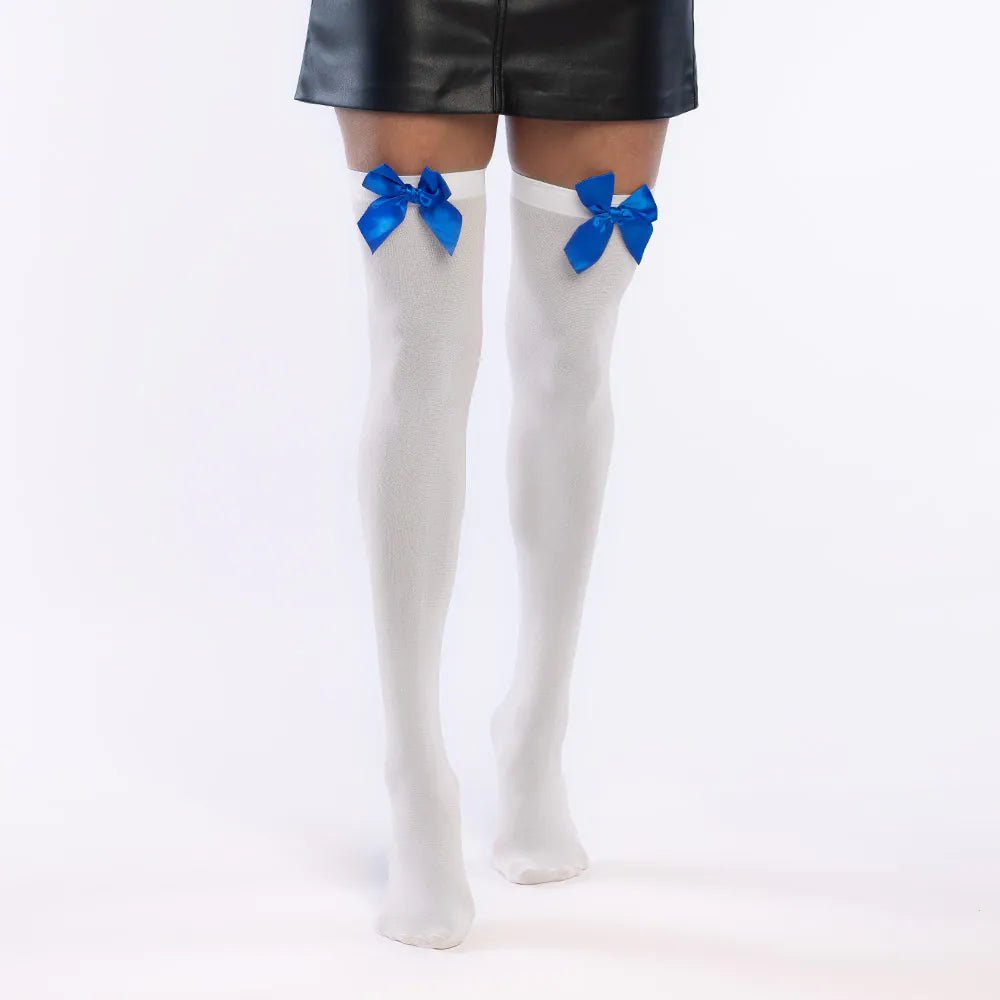 De här vita strumpbyxorna med blå satinbågar ger din outfit en glad och busig twist. Perfekt för att klä ut sig till skolflicka, sagokaraktär eller om du bara älskar iögonfallande detaljer - denna accessoar kommer garanterat att stjäla showen!